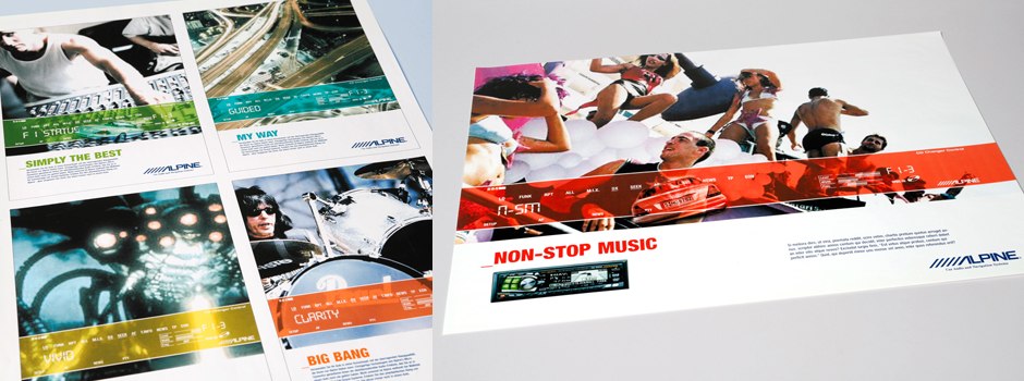 Alpine ist einer der weltweit führenden Anbieter von mobilen Medien-Lösungen. Für den deutschen Markt sollte eine Anzeigenkampagne entwickelt werden, die in 7 Motiven die entsprechenden Bereiche der Sparte Car-Audio- und Navigationssysteme spannend in Szene setzt. Hier sehen Sie die